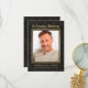 Tack till din familj och dina vänner för att de har deltagit i din kära begravning med det här moderna fotokortet för personlig. Den här manliga designmallen innehåller ett foto på framsidan som gör att du kan byta till ett eget foto med ett enkelt men elegant faux guld ram på bakgrunden av ytsvart läder. Ovanför ett handskript i faux guld står det "In Loving Memory". Under fotot finns ett namn och data som du kan anpassa. Kortets baksida har ditt tack, namnteckning och citat för att du ska kunna anpassa dig. Designad av konstnären ©Susan Coffey.