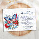 Memorial Butterfly Patriotic American Flagga Funeral Tack Cards. Dessa sympatigravkort har en patriotisk fjäril med vattenfärg i en amerikansk Flagga med vilda blommor. Dessa minneskort är perfekter för begravning av tackkort eller firande av livets tackkort. Anpassa med ditt tack, namn och data....COPYRIGHT © 2023 Judy Burrows, Black Hund Art - Med alla Höger reserverade. Memorial Patriotic Butterfly Sympathy Funeral Tack You Card