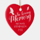 Elegantens minnesmärke jultomathjärtsornament med en röd bakgrund som kan ändras till vilken färg som helst, vita duvor, ett vackert ordspråk, deras namn, data och ett foto av dem på baksidan.