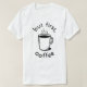 En hett kaffe i mugg med "Men första kaffet"-citat.