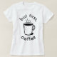 En hett kaffe i mugg med "Men första kaffet"-citat.