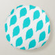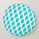 Den här rundade kudden har en sekvens av platta löv av turkos på vit bakgrund.