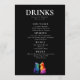 Back (Drinks): Flip for the beverage list, labeled “DRINKS” (also editable). Organize by Cocktails, Spirits, Wines, Beers, Non-Alcoholic, Coffee & Tea—whatever you’re pouring. Highlight your signature his/hers/ours cocktail, mocktail options, or local craft picks. Names, date, and event location fields are included and easy to personalize.