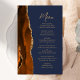 Den moderna bröllop-menyn på den lämnat kant i eleganten har en bränd orange och rost vattenfärg agate gräns trimmad med faux guld glitter. Anpassadet kombinerar handskriftsskript för guld-färgad och sans serif typsnitt på en marin blå bakgrund. Den omvända sidan har en matchande bränd orange och guld agate-design.