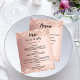 Observera att den här menyn/det här programmet är pappert och mycket tunt. För tjockare menyer/program (samma design), besök vår butik. Färggradientbakgrund för ro guld. Svart text. Dekorerad med konetti. Framsida: Anpassa och lägg till ditt namn, datum och menyn. Tillbaka: Program. Om du har ett stort program kan du minska radavståndet.