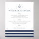 Designat för att matcha vår insamling av Nautisk Mix bröllop, är elegantens skylt vid stil vid kusten perfekt för att placera dig vid pub för att dina vin, spritdrycks- och ölval med gäster. Anpassa huvud och sex fält, med en trio marinblått rand och ett ankare överst.