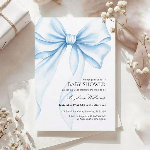 This baby shower menu, adorned with a blue watercolor bow, is perfect for celebrating your pregnancy and the arrival of your baby. The delicate pastel design with airy ribbons creates an atmosphere of comfort, warmth, and joyful anticipation.