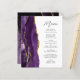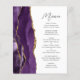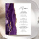 Den moderna menyn bröllop på den lämnat kant i eleganten har en lila vattenfärgsagatdesign som trimmas med faux guld glitter. Anpassadet kombinerar handskriftsskript för kol-grått och sans serif typsnitt på vit bakgrund. Lila och guld agate-konstruktionen upprepas på baksidan.
