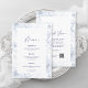 Det här bröllop-kortet för dubbla vid elegant har en mjuk dammig blå blommigt gräns och tidlös typografi. På framsidan visas ett hjärtligt tack som du sänder tillsammans med en QR-kod för gäster att visa och foton från den stora dagen. På motsatt sida leder en väl arrangerad meny gästerna genom kvällens kulinariska upplevelse. Perfekt för romantiskt, trädgårdsmässigt eller klassiskt bröllop som vill ha en personlig och modern beröring.