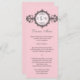 Ett menykort som tar dess påverkan från art décoeraen. Ett utsmyckat musikband, tittar något liknande ett Victorianarmbandsur, presenterar medaljonginnehav parets monogram. Bleken - rosa bakgrund skrivar ut ett subtilt mönster som en watermark. Tillfoga eller förminska utrymme mellan första och den sist initialer för att balansera med centralmonogramen. Tillfoga en skräddarsy meny under. En klassikerlook till uppsättningen mooden för något bröllop. Tillgängligt i omväxlande färger med att matcha produkter.
