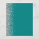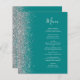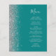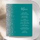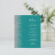 Den moderna bröllop-menyn på den lämnat kant i eleganten har en silver faux glitter gräns. Anpassadet kombinerar handskriftsskript för silver grått och kopparplåt typsnitt på en tårblå bakgrund. Den omvända sidan har en passande teal och silver-design.