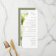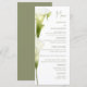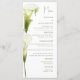Meny för ett modernt bröllop. Ömtåliga callaliljor i mjuka gröna nyanser avbildas mot en ljus bakgrund och skapar en atmosfär av sofistikering och lugn. Designen är modern, luftig och perfekt för ett stilrent, romantiskt bröllop.