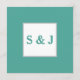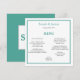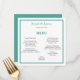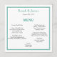 Minimalistisk teal och grått bröllopsmeny. All information kan anpassas till din bröllopsdag. Teckensnittet stil och färg på framsidan kan anpassas till färger i bröllop. Det första monogrammet på baksidan av kortet kan anpassas så att det matchar framsidan.