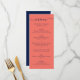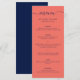 Elegant anpassningsbar navy blue och koral bröllop-meny med ett modernt skript-teckensnitt. Anpassa enkelt onlinen. Matchningsalternativ som är tillgängliga för att komplettera denna minimalistiska meny bröllop.