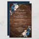 Mörk navy blue blommigt geometric bröllop-meny med elegant bouquet av marinblått, royal blue, white , ro och sage grönt eucalyptus löv och elegant glitter neutralt ram på rustik träbakgrund. Kontakta mig om du behöver hjälp med anpassning eller om du behöver någon annan produkt med den här designen.