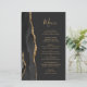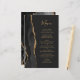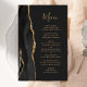 Den moderna bröllop-menyn på den lämnat kant i eleganten har en svart vattenfärgad agate gräns som trimmas med faux guld glitter. Anpassadet kombinerar handskriftsskript för guld färgad och typsnitt för tryckplåt på en svart bakgrund. Den omvända sidan har en matchande svartvit och guld agate-design.