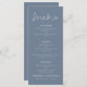 Meny för utskrivbar Dusty Blue och White Text Bröllop. Tillgänglig digitalt och utskriven. En informell teckenuppsättning i svart för huvudmenyn som kompletterar resten av texten som du lätt kan anpassa,