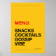 Lysa upp ditt kök med humor! “MENY: SNACKS, DRINKAR, SKVALLER & VIBRATIONER” affisch i modern typografi. Finns i flera bakgrundsfärger, perfekt som heminredning, presenter eller köksväggkonst.