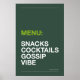Lysa upp ditt kök med humor! “MENY: SNACKS, DRINKAR, SKVALLER & VIBRATIONER” affisch i modern typografi. Finns i flera bakgrundsfärger, perfekt som heminredning, presenter eller köksväggkonst.