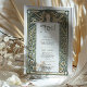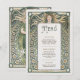 Detta Art nouveau-inspirerade menykort för bröllop är en vacker blandning av elegans och natur. Med en seriös kvinna som är förtjust i grönt, omgiven av intrikat blommigt och vinskt mönster, fångar denna utformning kärnan i Art nouveau stil. Den mjuka grönten, krämen och de ömtåliga guldfärgade nyheterna skapar en naturlig och harmonisk palett, perfekt för ett trädgårdstema eller vintage bröllop. Den ornerade blommigten gräns och klassiska typografin på baksidan ger dig ett förfinat ram för din bröllop-meny, vilket gör att du kan lägga till sofistikering och charm till vilken bröllop-dekoration som helst. Det här menykortet är idealiskt för dem som uppskattar konst, natur och skönhet utan tidsplaner.