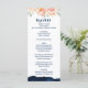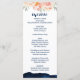 Det här menykortet för blommigt och marinfärgad middag är perfekt för ett modernt bröllop. Konstruktionen har en känslig kaskadbukett av rosa och persikoblommor som står i kontrast till bassäng av marinblå vattenfärg. Den här menyn kan användas för bröllopsmottagning, repetitionsmiddag eller vad som helst.