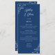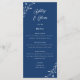 Det här vackra bröllopsmenykortet har en underbar marin blå bakgrund med handdragna vilda blommor och elegantens typografi i vitt. Tillsammans skapar dessa inslag en strålande meny, men elegant bröllop, som skulle vara perfekt för ett romantiskt bröllop när som helst på året. Den här designen koordinerar med vår Rustic Wildblommor bröllop-svit.
