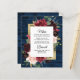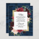 Utformningen har en mörk marin botten av blått lingstall av trä som dekorerats med en elegant blommigt av blommor av peony ro, eucalyptus greenery med mera i burgundsnyans, Marsaladött, maron, rosa osv. Utformningen har också ett utskrivet guld färgad gräns under blommigtens andetag för ett modernt utseende.