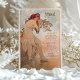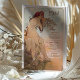 Det här krävande menykortet i Art nouveau bröllop ger bröllop en stark, naturinspirerad charm. Utformningen har en stillastående kvinna som står med en krona av röda blommar, sitta fredligt vid vatten kant, med flytande grenar och mjukt löv runt henne. Den lugnande färg-paletten med mjuka blues, varma beiges och muterade gröntar förstärker den drömmande, vintage atmosfären hos detta kort, perfekt för bröllop med ett naturligt eller bohemiskt tema. På baksidan av kortet presenter på menyn i en förfinad layout skapar du det som ett tillägg till din speciella dags dekoration.