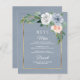 Menykort för Dusty Blue Rosa Blommigt Bröllop - har en dammblå bakgrund i vattenfärg med guld ram som trimmas i eukalyptus och grönt med blommigt inslag i grått/vitt, dammblått och rosa/persika. Visa matchande samling på den här sidan om du vill söka efter matchande produkter