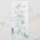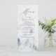 Menykort för elegant personligt bröllp med menyinformation längst upp på menyn med en skog av grått & misty blue water color gräs träd vid grund. Menyn återgår till en marin blå vattenfärgsbakgrund med utrymme för text och foton. Designad att samordna med vår Elegant Winter Forest bröllop samling.