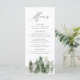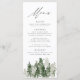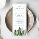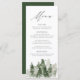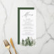Menykort för elegant personligt bröllp med menyinformation för bröllop överst på menyn med en skog med mörk hunter grönt & sage vattencolor gräs träd vid grund. Menyn återgår till en grönt med mörk- och bildbakgrund med plats för text och foton. Designad för samordning med vår insamling av Gräs-skogen bröllop.