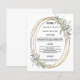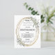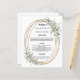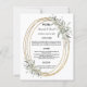 En vit bakgrund. En ovalfaux guld tittar ram med en grönt gienery. Anpassa och lägg till namn, datum och meny. Svart text. 1 lakan = 1 meny utskriven kant till kant.