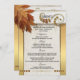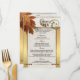 Ett bröllop-menykort med färgstarkt höst löv på en vit, rostfri träpanel i shabby chic, inramat av ett golden infogat och festive metallsnurrar. Ett vackert kort och elegant för en höstmiddag bord.