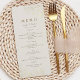 Förfinat och elegant bröllop-menykort med delikat guld-blommigt i mjuk elfenbensbakgrund. Den minimalistiska layouten lyfter varje kurs med sofistikerad serif typsnitt. Perfekt för formella mottagningar och vintage-inspirerad bröllop med klassisk beröring.