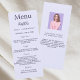 Menykort för födelsedagsfest. Anpassa och lägg till namn, ålder, datum och meny. En lavender, violett färgad bakgrund. Lila färgad brev. Tillbaka: Lägg till ett foto av födelsedagsflickan, roligt fakta.