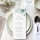 Menykort för bröllop som skrivs ut i anpassningsbar. Använda designen verktyg om du vill anpassa layout, färg och text i bakgrunden med information om bröllop-menyn. Den här eleganten har en vattenfärgsformad blommigt gräns med sunt grönt och blommar med guld och marin text.