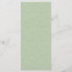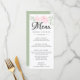 Elegantens menydesign har rosa ros som är inkapslat i modernt grönt. Menyn är skriven i ett vackert stort skript. Det finns utrymme för er att lista och beskriva fyra kurser. Du kan enkelt lägga till din information och justera positionen. Baksidan av menykortet är grönt med en mycket subtil löv mönster.
