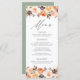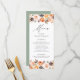 Menykort för elegant personligt bröllp som innehåller menydetaljer för bröllop i mitten av menyn med vattenfärgblommor, självhäftande färger och löv i skuggor av rosa, persika, orange, grädde, brun och grönt. längst upp och grund. Menyn återgår till en solid grönt bakgrund med utrymme för text och foton. Designad för att samordna med vår insamling av Rustic Fall Blommigt bröllop.
