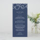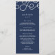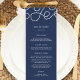Kustens chic bröllop-meny i klassiskt marinblått innehåller ditt starterska kurser, inlägg och efterrätter i vitt brev, där ditt namn och bröllop-datum är täckt av en vit nautisk repillustration. Samordnar med vår sjövärdiga samling för bröllop och firande på sjön, stranden eller sommaren. Lägg till menyinformation genom att Använda mallen fält och klicka sedan på Anpassa om du vill flytta inslag om det behövs. Behöver du hjälp? Kontakta mig via länken "Fråga den här designern" på den här sidan.