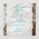 Menymall för Seashells bröllop på fyrkantig papper. Skapat för enkel mottagning med två textmallar. Lägg till en titel som innehåller parets namn. Alla menyalternativ listas i ett stycke med hjälp av blanksteg för att separera avsnitt för aptiserare, entréer och desserter, eller ditt val. Teckensnitt är handskriven avslappnad i mörken brun. Seashell-fotografering är bakgrundsbilden och är detsamma på baksidan.