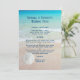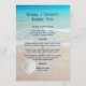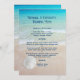 Bröllop-menymall med bakgrund på strandscenen och vit sanddollar. Det finns ett djärvt skript överst för en titel som kan innehålla parets namn. Alla menyalternativ listas i styckeformuläret så att du kan bestämma hur det ska se ut. Urvalsmenyn är uppdelad i sektioner för aptisatorer, entrées och desserts. Baksidan av den pappra har samma strandscen utan sanddollarn.