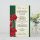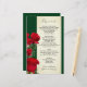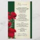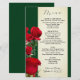 Röd ros-menymall för bröllopsmottagning, möhippa luncheon eller andra stora evenemang. Mörk grönt papper, med sepiatonpanel för text och realistiska blommor och knoppar från ro som dekorerar kant. Omvänd är solid grönt. "Menu" längst upp med namn och datum i grund. Menymarkeringar läggs till i ett stycke med hjälp av mellanslag efter behov.