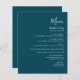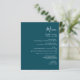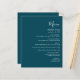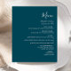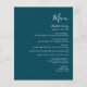 Den här enkla, moderna bröllop-menyn har vit text på en mörk, färgblå bakgrund. Ord "Meny" visas i snyggtens handskriftsgrafi. Lägg till parets datum namn och bröllop i skript och kursiv stil, tillsammans med menydetaljer i sans serif-teckensnitt. Den omvända sidan är en matchande ton av solid teal.