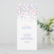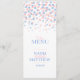 Dubbla-sidig konfektyr krossade punkter på den grafiska bröllopsmiddagsmenyn i rosa ros kvarts, friskblått på vit bakgrund. Kontakta mig om du behöver hjälp med att passa in kurser på den här menyn. © Art and design by Sarah Trett.