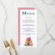 Den här elegant bröllop-menyn innehåller en lekfull vattenfärgsillustration av färgstarka makaroner i Fransk, som lägger till en aning parisisk charm och stollig. De vita visningarna på framsidan är varje kurs i ett modernt serif-teckensnitt, med mjuka rubriker för en romantisk accent. Baksidan är en solid rosa, perfekt för ett sammanhängande, contemporary utseende. Idealiskt för vår, sommar eller Fransk-inspirerat firande, blandar den här menyn konstnärligt lugn med minimalistiskt stil.