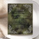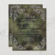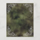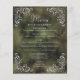 Den här vintage-inspirerade menyn bröllop innehåller texten i blek silver grått-skript och serif typsnitt, som är framtagen av en vintage elegant foliemotif i fyra hörn på en silver vattenfärgsbakgrund. Bakgrunden till ram och vattenfärgen upprepas på motsatt sida.