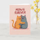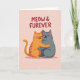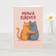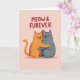 This greeting card shows two simple, stylized cats hugging in the center on a blush-pink background. One cat is tangerine orange with a striped tail, and the other is a soft grey, and they lean into each other like they feel safe together. Both cats have their eyes closed with small rosy cheeks, giving them a calm, happy look. Small white polka dots are scattered around the background, adding a light, gentle feel to the scene. Near the top, the card reads “MEOW & FUREVER” in rust-red block letters with a slightly worn texture. The message sits above the cats and ties the whole design to romance and lasting affection ❤️💌. It feels like a sweet little reminder of steady love and close friendship, perfect with a note and maybe some chocolate 🍫.