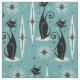 För kattloving, retroentusiast, min ursprungliga vektorbild av sömnblått svarta katter, stjärnsprängningar och diamanter i mitt århundrade av atomiskt stil, i svart och blek grått, på en kadeblått bakgrund, med simulerat tygkorn. I den här variationen finns katterna i vågräna, även i lodrät.
