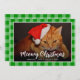 Ett jullkort för kattälskare, med platshållarfoto av en ingerkatt med röd julhatt (som du kan ersätta med din egen katt) och texten "Meowy jul" i vitt skript, och namnen av katten och familjen i mindre brev under den, allt detta på en grönt gingham plaid bakgrund som fungerar som en ram. Platshållarkattfotot är av Alexas_Fotos från Pixabay och kan inte användas för kommersiell använda.