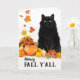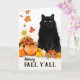 En stor fluffy svart katt är sitta bredvid en hög av höst löv och olika gourder och pumpor på omslaget till detta Meowy Halloween-kort. Halloween-kort för dina favoritboon. Meowy Fall Y'all. Anpassa omslaget och texten som du vill. Art, bild och versell copyright © Shoaff Ballanger Studio, 2023.